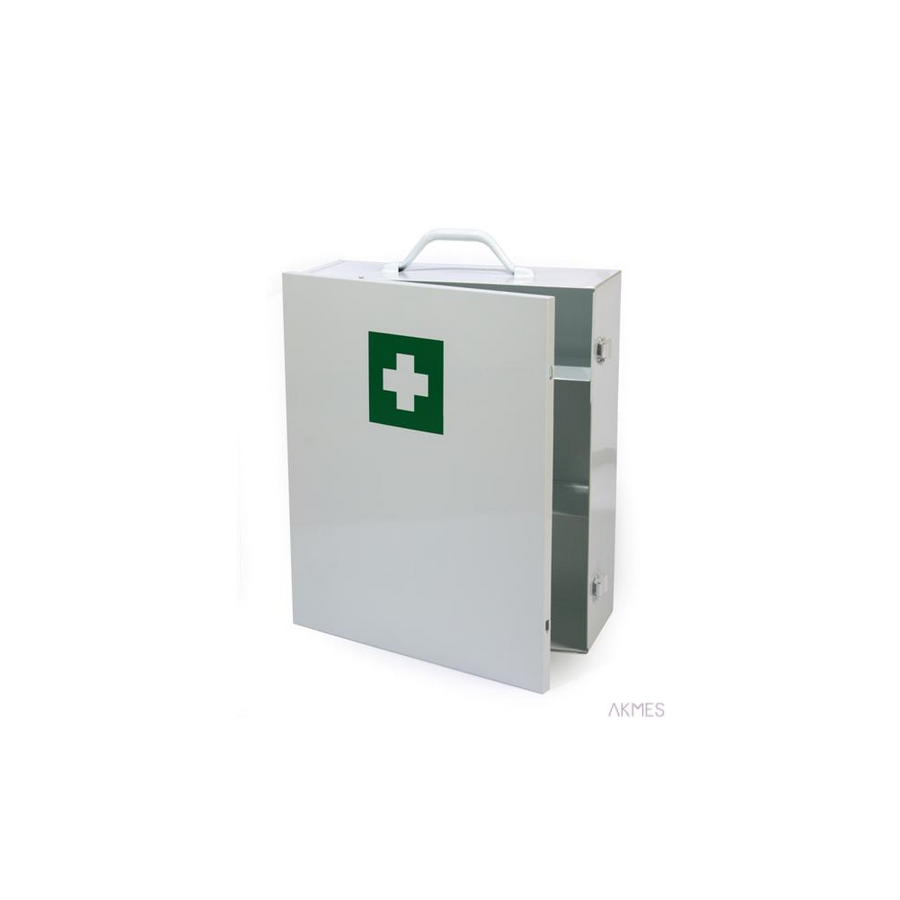 Metalowa szafka zamykana na klamry_trzy półki_wygodny uchwyt do przenoszenia apteczki_możliwość powieszenia na ścianie_kolor biały _ na drzwiczkach biały krzyż na zielonym tle_wymiary: 415x350x145 mm.