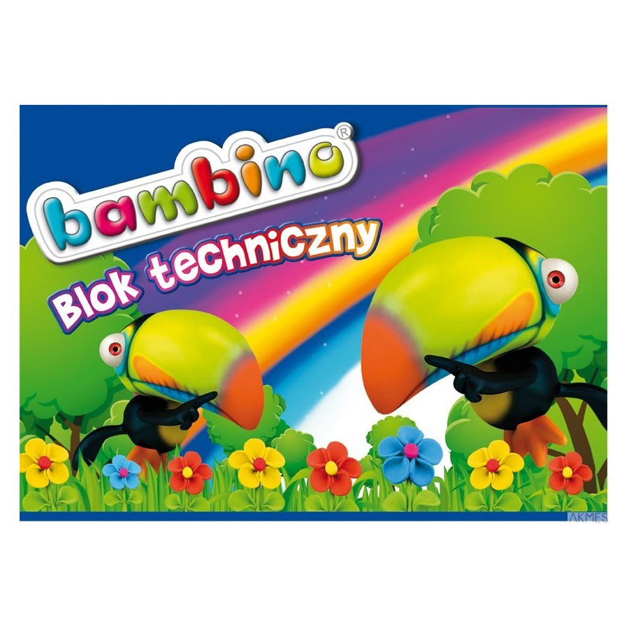 Blok techniczny BAMBINO__okładka kredowa, nabłyszczana o gramaturze 115 g/m2_wykorzystuje najnowsze motywy wzornicze BAMBINO__biały _ gramatura papieru _ 200 g/m2__kolorowy _ gramatura papieru _ 160 g/m2__całość usztywniona tekturowym podkładem__jednostka sprzedaży 1 sztuka.