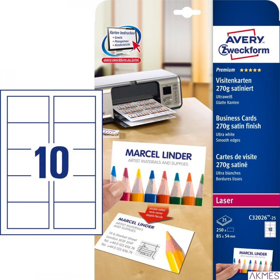 Wizytówki Quick&Clean C32026-25 85x54 mm 25 ark. 250 szt., 270 g, satynowane, śnieżnobiałe, Avery Zweckform