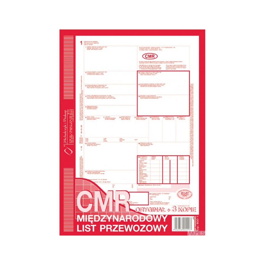 800-1N CMR A4 80kartek 1+3 numerowany międzynarodowy list przewozowy M&P