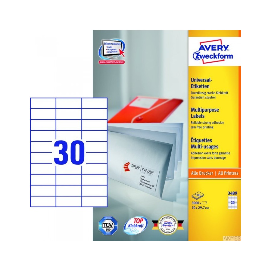 Trwałe etykiety uniwersalne 3489 70x29,7 100ark Avery Zweckform