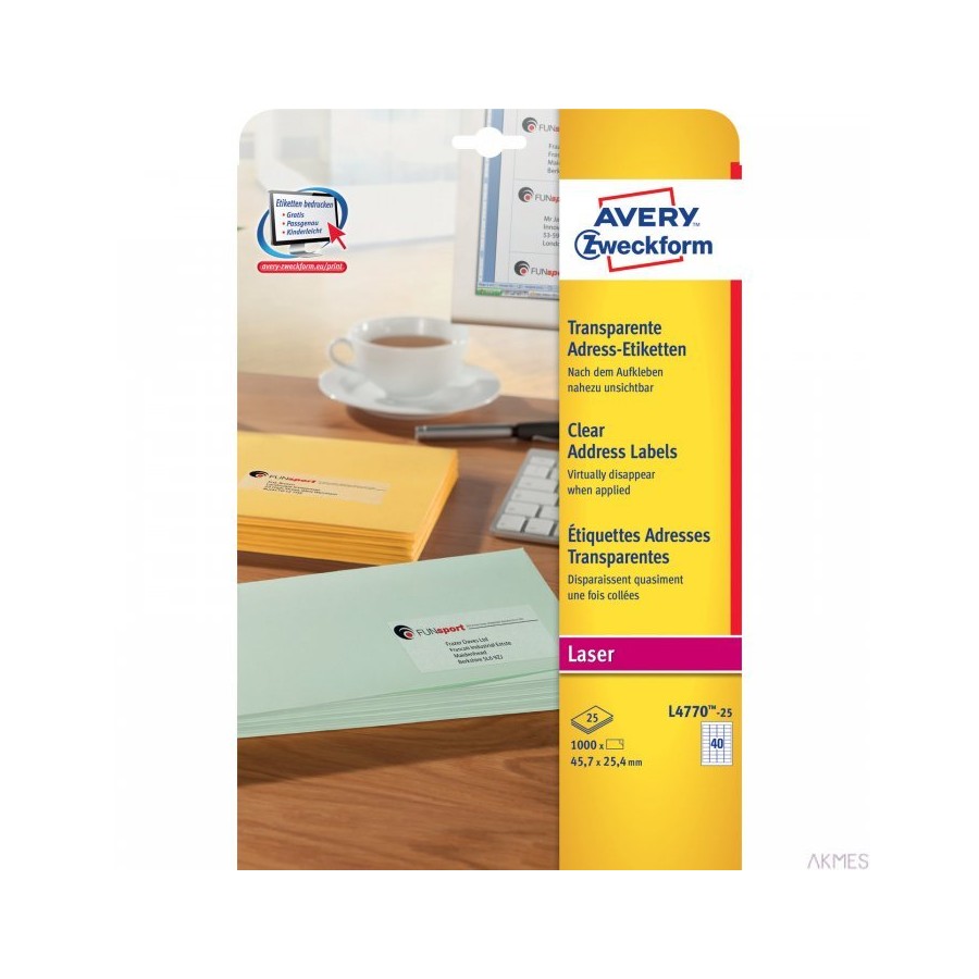 Etykiety adresowe L4770-25 45,7 x 25,4 25 ark. przezroczyste Avery Zweckform