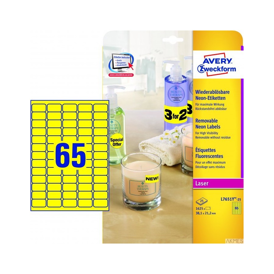 Etykiety żółte neonowe L7651Y-25 38,1x21,2 25ark Usuwalne Avery Zweckform