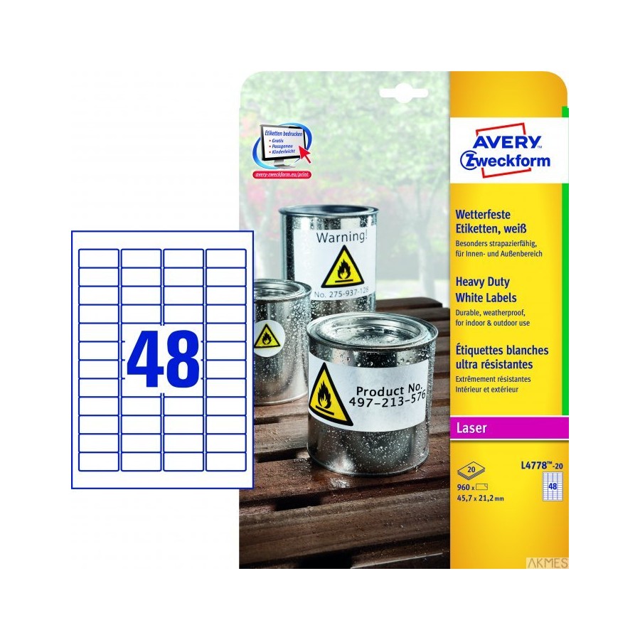 Etykiety Heavy Duty L4778-20 45,7 x 21,2 20ark Avery Zweckform, białe, poliestrowe