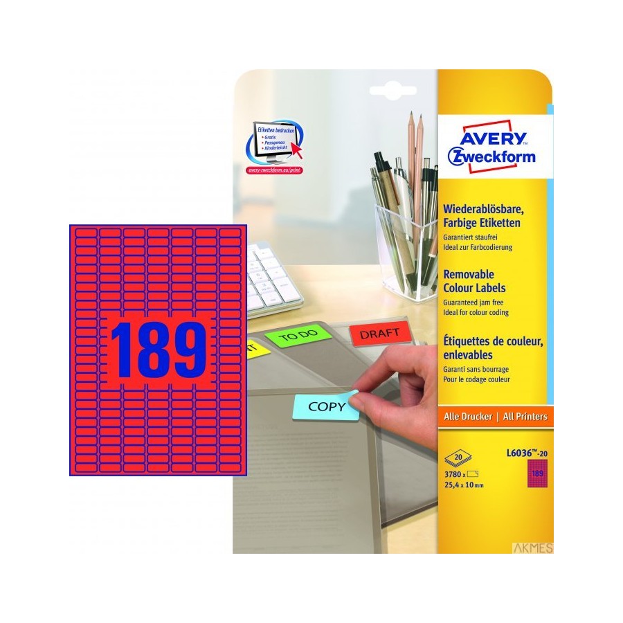 Etykiety czerwone L6036-20 25,4 x 10 20 ark usuwalne, Avery Zweckform