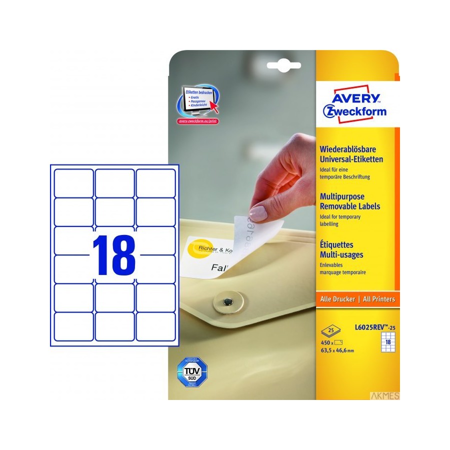 Etykiety uniwersalne L6025REV-25 63,5x46,6 30ark Usuwalne, Avery Zweckform