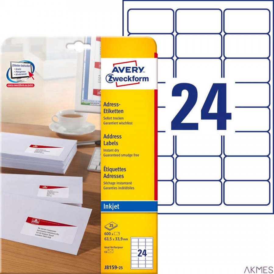 Etykiety adresowe J8159-25 63,5 x 33,925 ark. białe Avery Zweckform