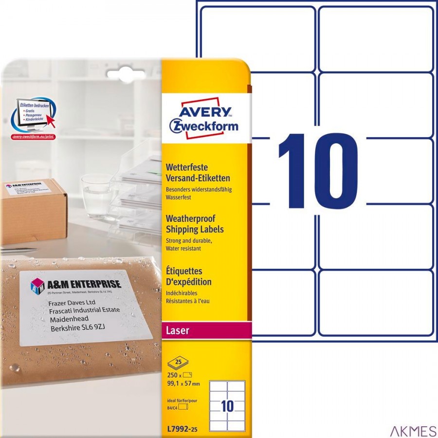 Etykiety wysyłkowe L7992-25 99,1 x 57 25ark. odporne na zmiany pogodowe, Avery Zweckform, białe, poliestrowe