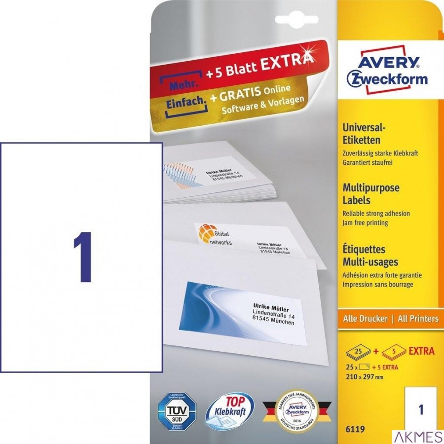 Trwałe etykiety uniwersalne 6119 210 x 297 30ark Avery Zweckform