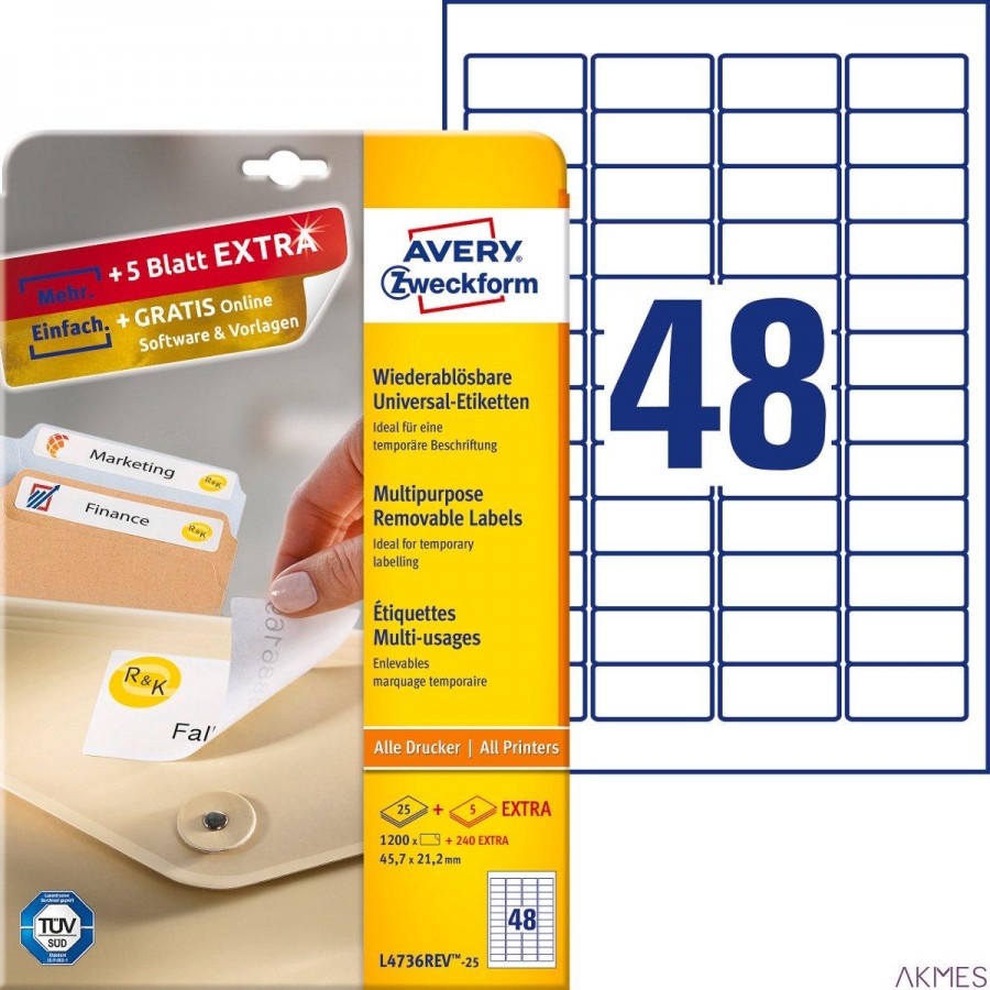 Usuwalne etykiety uniwersalne, A4, 10 ark./op., 45,7 x 21,2 mm, białe, AVERY ZWECKFORM, L4736REV-10