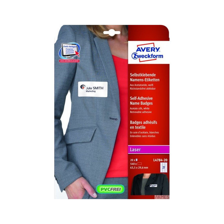 Samoprzylepne identyfikatory L4784-20 63,5x29,6 20 ark., białe, sztuczny jedwab, Avery Zweckform
