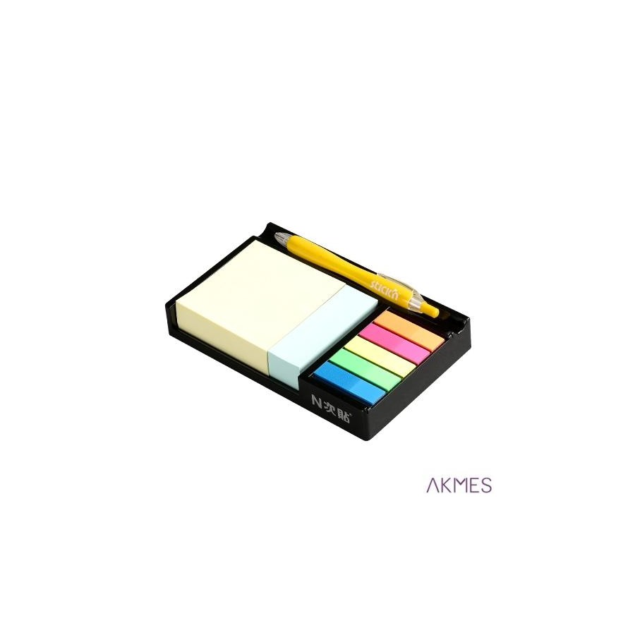 Mniejszy przybornik zawiera: notes 76x76mm, 400 karteczek - mix 3 kolorów oraz 380 zakładek indeksujących papierowych o wymiarach 76x14mm - mix 4 kolorów. Większy przybornik zawiera: notes żółty pastelowy 76x76mm - 200 karteczek, 200 zakładek niebieskich pastelowych 76x25mm oraz 125 foliowych zakładek indeksujących 45x12mm - mix 5 kolorów neonowych. Dodatkowo obydwa przyborniki posiadają specjalne miejsce na umieszczenie długopisu."