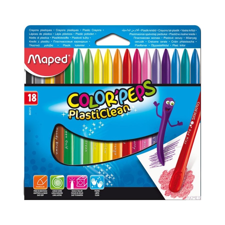 Nowa gama kredek plastikowych Maped. Wyprodukowana zgodnie z wszystkimi regulacjami dotyczącymi produktów przeznaczonych dla dzieci. Kredki mają trójkątny przekrój, z jednej strony są zaostrzone do precyzyjnego rysowania, a z drugiej płaskie do zamalowywania większych powierzchni. Intensywne kolory. Nie brudzą rąk. Zużywają się 3 razy wolniej niż standardowe kredki. Łatwe do temperowania. Pudełko 18 szt.
