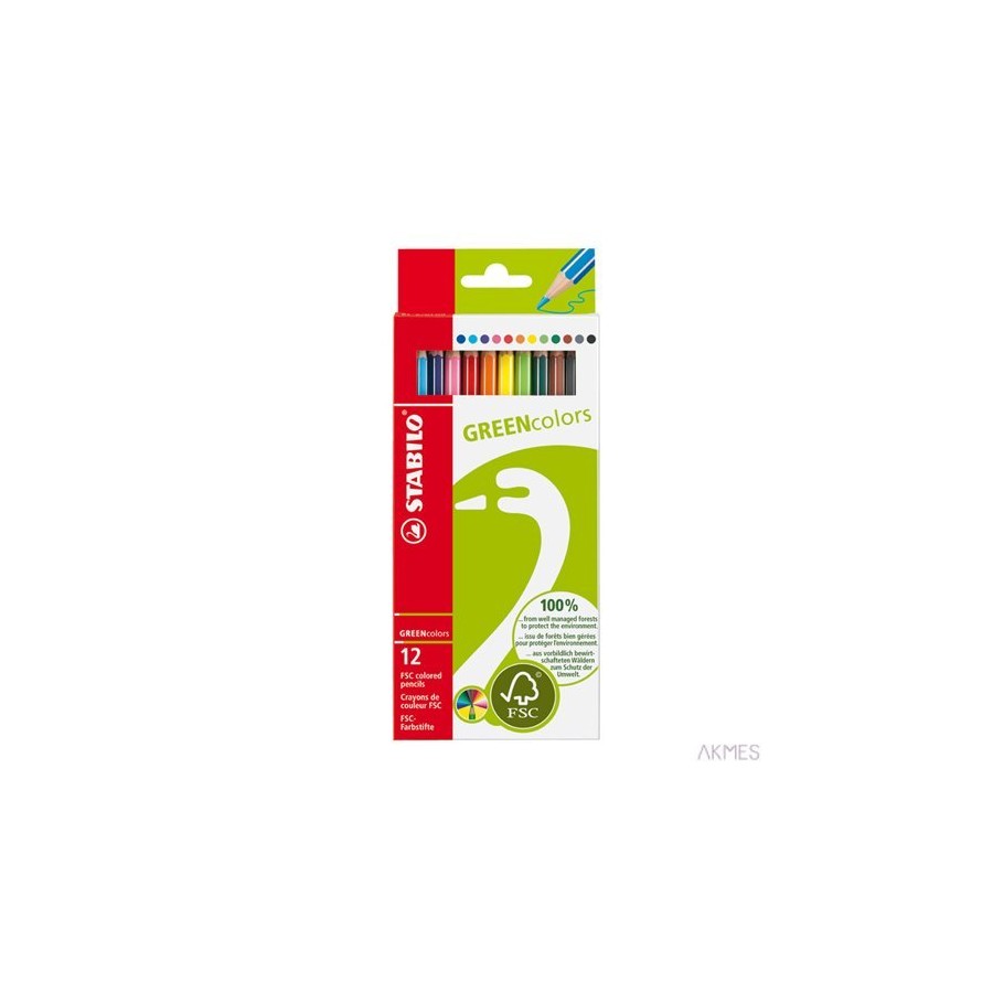 Kredki STABILO GREENcolors dostępne są w 12 kolorach. W trosce o środowisko, do produkcji tych kredek używane jest drewno z plantacji ekologicznych, posiadające certyfikat FSC oraz ekologiczny lakier, a do pakowania karton pozyskiwany w 80% z surowców wtórnych. Kupując produkty drewniane oznaczone certyfikatem FSC można mieć pewność, że pochodzą one z lasu zarządzanego zgodnie z dobrem przyrody, a także dobrem żyjących na jego terenie społeczności, czyli według Zasad Dobrej Praktyki Leśnej.