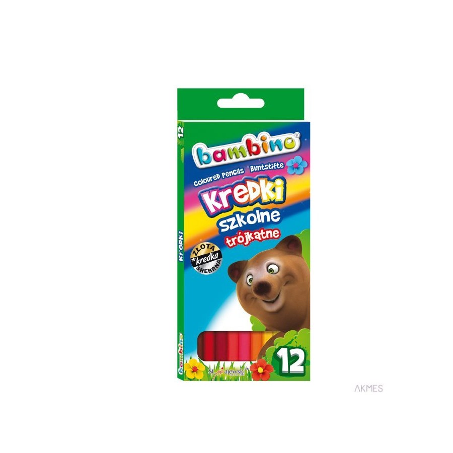 Kredki Szkolne BAMBINO_o przekroju trójkątnym__ergonomiczne kredki ołówkowe_o trójkątnym przekroju__idealnie dopasowują się do małej dłoni dziecka__bogata gama kolorów, w tym kredka złota i srebrna__kredki szkolne wyróżnia wysoka jakość__długość kredki 18 cm__jednostka sprzedaży 1 opakowanie.