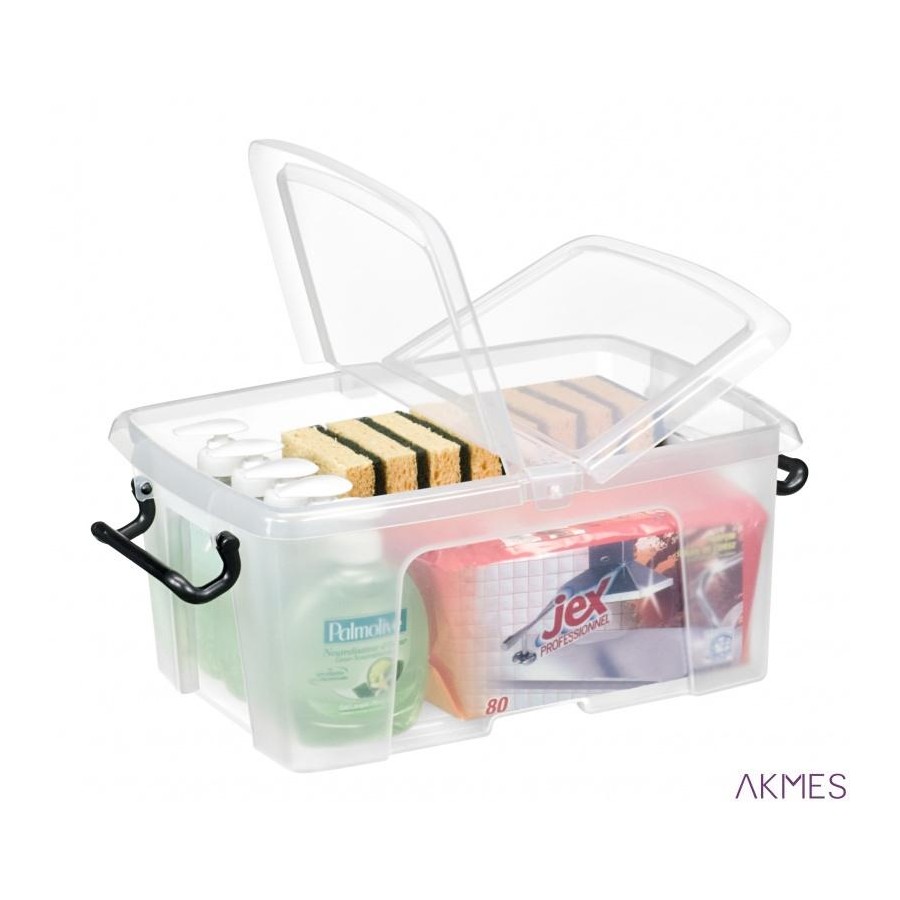 pojemnik biurowy, wykonany z odpornego, sztywnego polipropylenu w 100% nadającego się do dalszego recyklingu_do przechowywania lub archiwizowania dokumentów lub innych przedmiotów - także do użytku domowego_wyposażony w dwuczęściową pokrywę otwieraną z dwóch stron_dwa klipsy, umieszczone na przeciwnych biegunach, gwarantują solidne zamknięcie pojemnika_dzięki konstrukcji można je ustawiać w poziomie_pojemność: 12l_wymiary: 295x405x183mm_kolor transparentny.