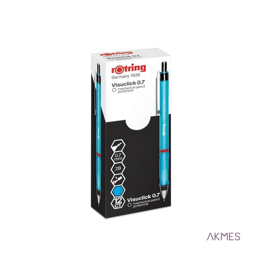 Ołówek automatyczny rOtring Visuclick to szybki i prosty w obsłudze mechanizm, który wyzwala kreatywność w klasie, biurze i poza nimi. Polimerowy rysik 2B pozwala na dynamiczne rysowanie i szkicowanie, a rysik 0.7 mm zapewnia śmiałe, ekspresyjne linie. Ciesz się godzinami swobodnego cieniowania, rysowania i pisania z wygodny, trójkątnym uchwytem. Wnieś życie do swoich przyborów z jego energicznym, kolorowym designem. Każdy Visuclick ma charakterystyczny czerwony pierścień rOtring na korpusie.__Opakowanie zawiera:_12 ołówków automatycznych Visuclick