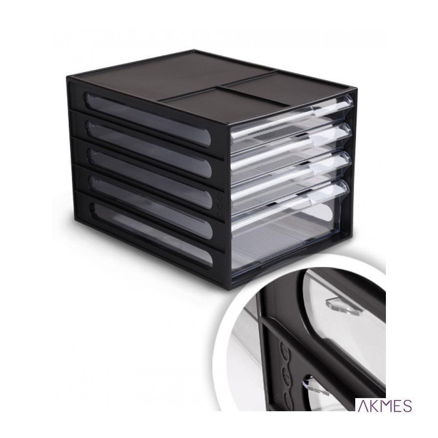 Moduł biurkowy 4 szuflady o szerokosci 250 mm. Zestaw składa sie z 4 wysuwanych szuflad na papier A4 i materiały biurowe. Wymiar 1 dolnej szufladki: 22,7 cm x 31,5cm, wys. 5,7cm. Wymiar 3 górnych szufladek: 22,7 cm x 31,5cm, wys. 1,5cm. Szufladki posiadają zatyczkę, która zapobiega wypadaniu z modułu. Każda szufladka posiada miejsce na opis ułatwiający sortowanie oraz uchwyt do łatwego wysuwania. Stabilna, solidna obudowa chroni dokumenty przed kurzem. Wymiar modułu 25,0 cm x 34,0 cm x 22,5 cm.. Kolor korpusu czarny, kolor szufladek przezroczysty.