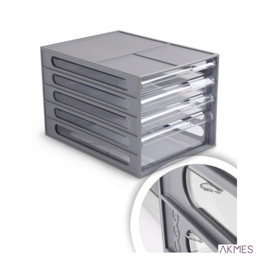 Moduł biurkowy 4 szuflady o szerokosci 250 mm. Zestaw składa sie z 4 wysuwanych szuflad na papier A4 i materiały biurowe. Wymiar 1 dolnej szufladki: 22,7 cm x 31,5cm, wys. 5,7cm. Wymiar 3 górnych szufladek: 22,7 cm x 31,5cm, wys. 1,5cm. Szufladki posiadają zatyczkę, która zapobiega wypadaniu z modułu. Każda szufladka posiada miejsce na opis ułatwiający sortowanie oraz uchwyt do łatwego wysuwania. Stabilna, solidna obudowa chroni dokumenty przed kurzem. Wymiar modułu 25,0 cm x 34,0 cm x 22,5 cm.. Kolor korpusu szary, kolor szufladek przezroczysty.
