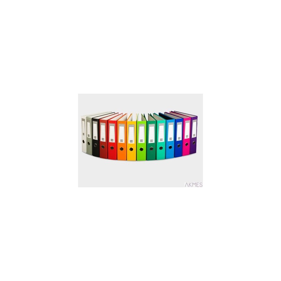Wykonany z twardej, 2 mm tektury_oklejka kolorowa, pokryta folią polipropylenową_wyklejka papierowa_mechanizm dźwigniowy z dociskiem_grzbiet o szerokości 50 lub 70 mm_oczko grzbietowe_okucia owalne_wymienna etykieta do opisu.