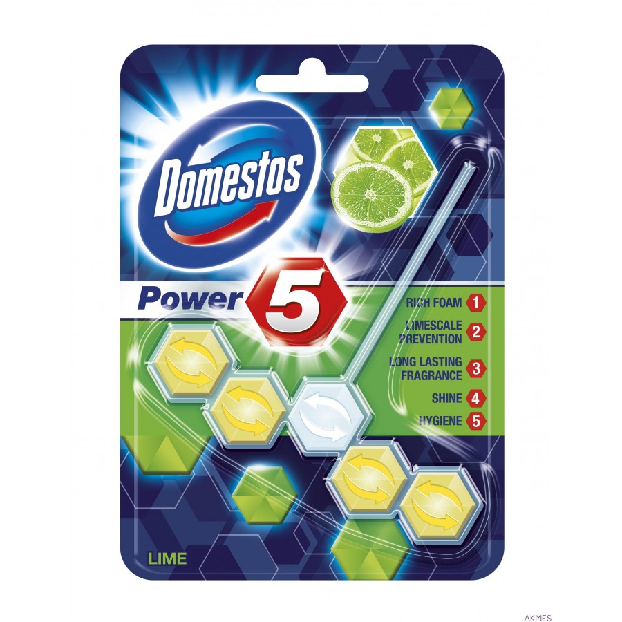 Kostka toaletowa Domestos Power 5 to kompleksowy produkt, który zapewni Twojej toalecie bezpieczeństwo i czystość: higienę, ochrona przed kamieniem, pianę, świeżość i połysk. Czy można oczekiwać czegoś więcej od kostki toaletowej?