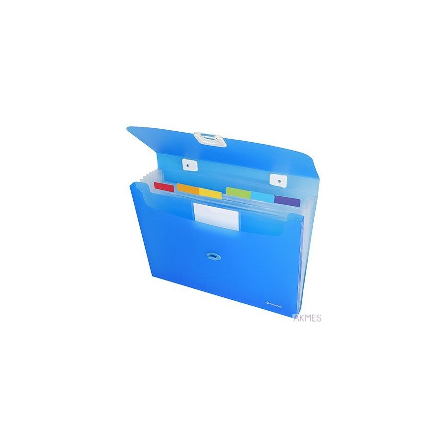 - Teczka z rączką wykonana z PP o grubości 0,7 mm.- Wymiary 33x24,5x4,5 cm.- 7 kieszonek przedzielonych przegrodami z miękkiego PP plusjedna sztywna kieszeń o grubości 1,5 cm z kieszonką na wizytówki.- Plastikowe zapięcie
