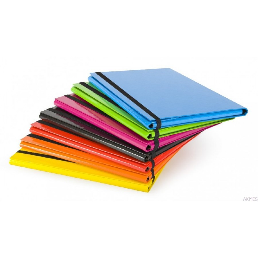 Wykonana z twardej 2mm tektury powleczonej folią PP. Posiada czarną wyklejkę z wysokiej jakości surowca. Zamykana na gumkę. Szerokość grzbietu do 20 mm. Innowacyjna gama kolorystyczna.