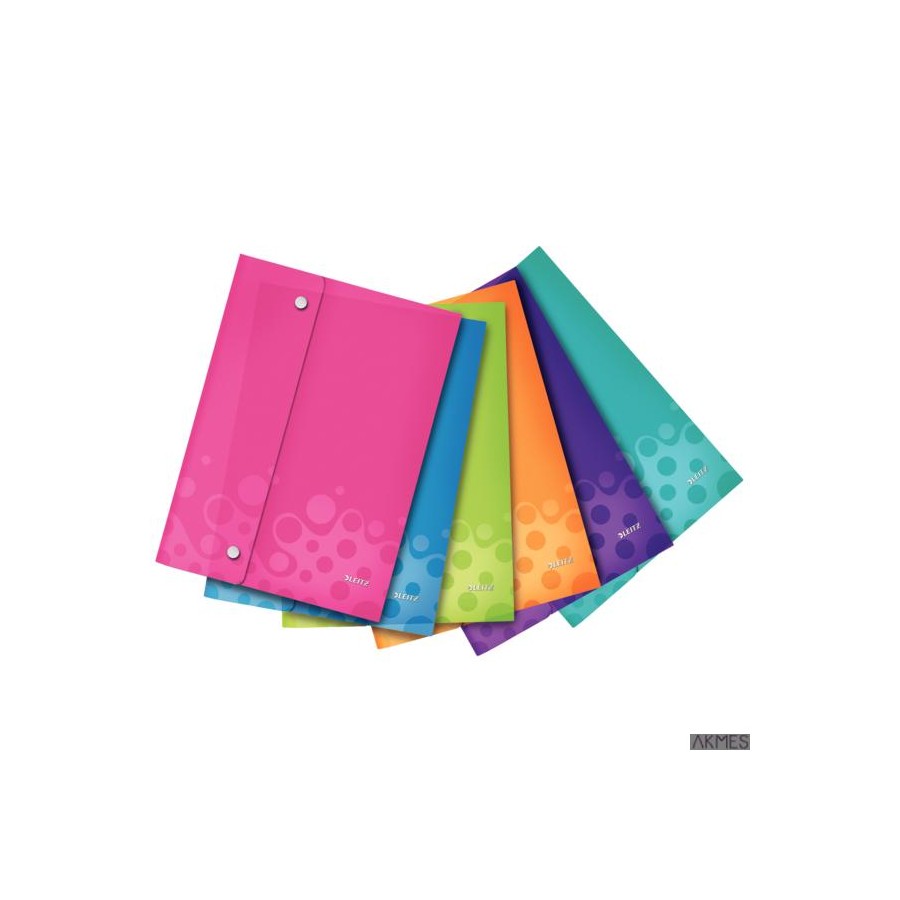 Teczka kopertowa Leitz WOW__ wysokiej jakości teczka wykonana z polipropylenu, w żywych kolorach WOW__ bezpieczne przechowywanie dzięki zamknięciu na zatrzaski __ do przenoszenia małych przedmiotów oraz dokumentów __ wycięcie ułatwiające dostęp do dokumentów __ folia PP podlega recyklingowi __ mieści 120 kartek A4 (80 gsm).