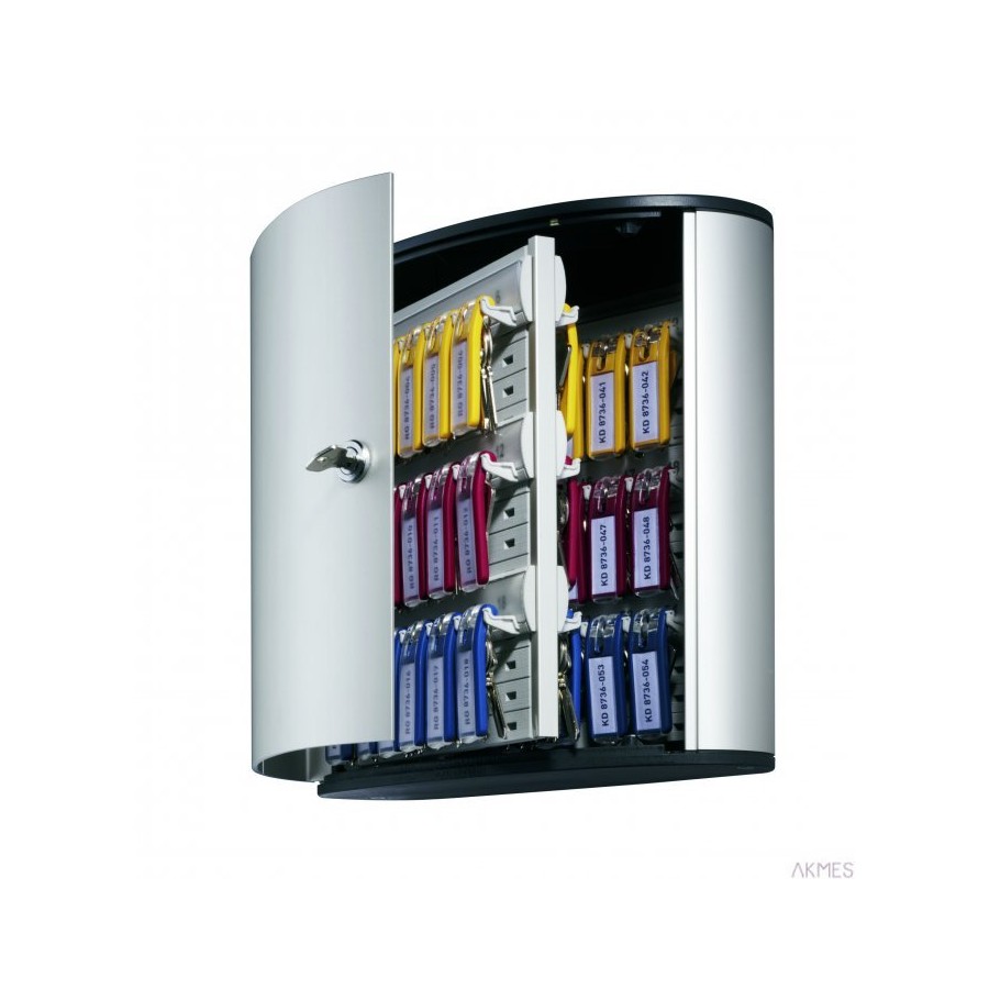 KEY BOX - skrzynki na klucze. Szafka na klucze z zawieszkami Durable_- ponadczasowe wzornictwo_- obudowa wykonana z aluminium_- każda skrzynka zamykana na zamek (w komplecie dwa klucze _ oprócz skrzynki na 12 kluczy zamykanej na rygiel)_- każda skrzynka wyposażona w woreczek z sześcioma zawieszkami na klucze w różnych kolorach, zawieszki te służą jako zapas_- w zestawie znajdują się kołki niezbędne do montażu skrzynki na ścianie_- Wielkości odpowiednio na 12, 18, 36, 54, 48 i 72 klucze._- jednostka sprzedaży 1 sztuka