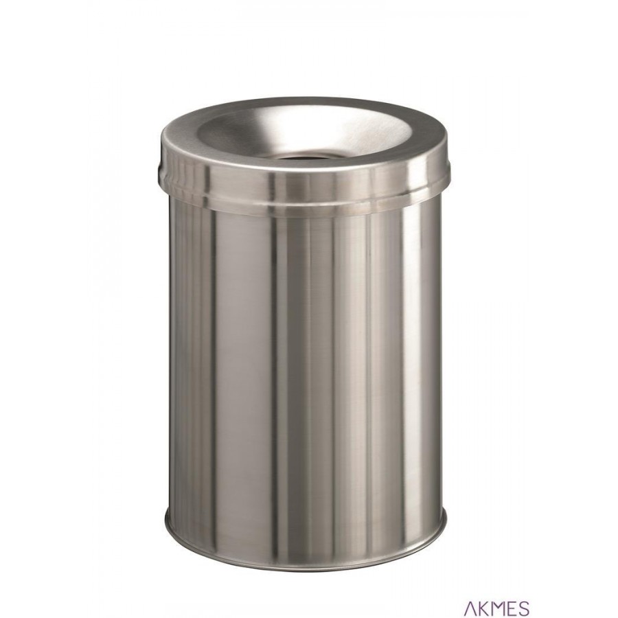 Okrągły, trwały kosz na śmieci z polerowanej stali nierdzewnej, z samo-gaszącą ogień pokrywą, która odcina dopływ tlenu do kosza i tym samym stopniowo gasi płomienie.
