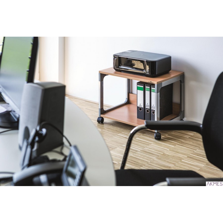 Wielofunkcyjny stolik biurowy na kółkach z dwoma półkami. Wykonany ze stali pokrytej żywicą epoksydową, z narożnikami z tworzywa sztucznego wzmocnionego włóknem szklanym oraz pokrytymi melaniną półkami o grubości 19 mm. Wymiary górnej półki: 600 x 432 mm (S x G) Wymiary dolnej półki: 560 x 413 mm (S x G) Wymiary zewnętrzne: 600 x 477 x 432 mm (S x W x G)